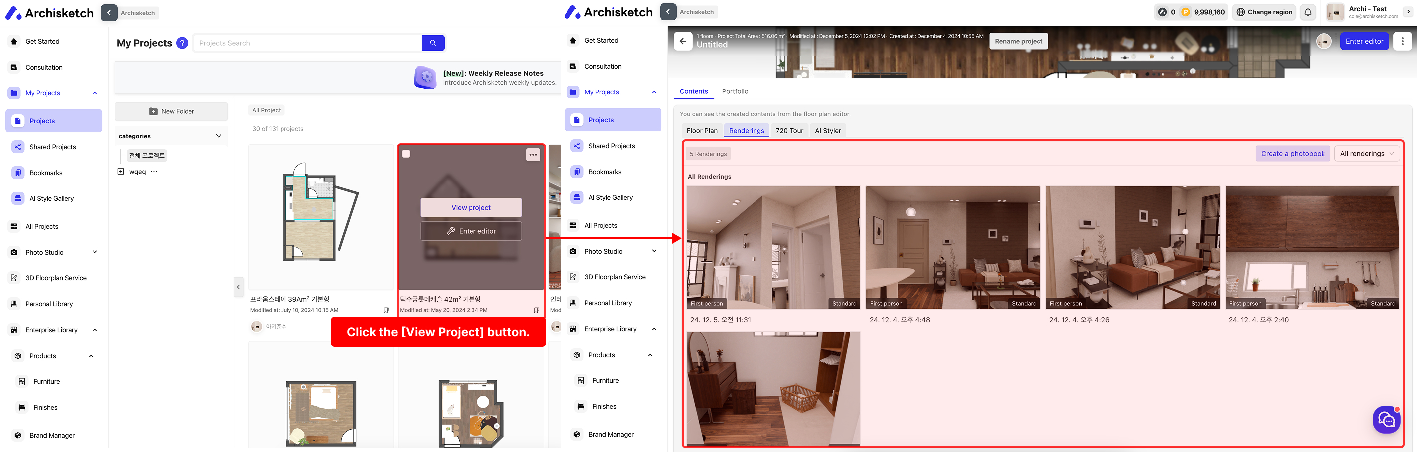 1.1. On the Archisketch dashboard, go to [Projects > My Projects] or [All Projects] and click on a project card. (If no project exists, click the[Create New Project] button to make one.)