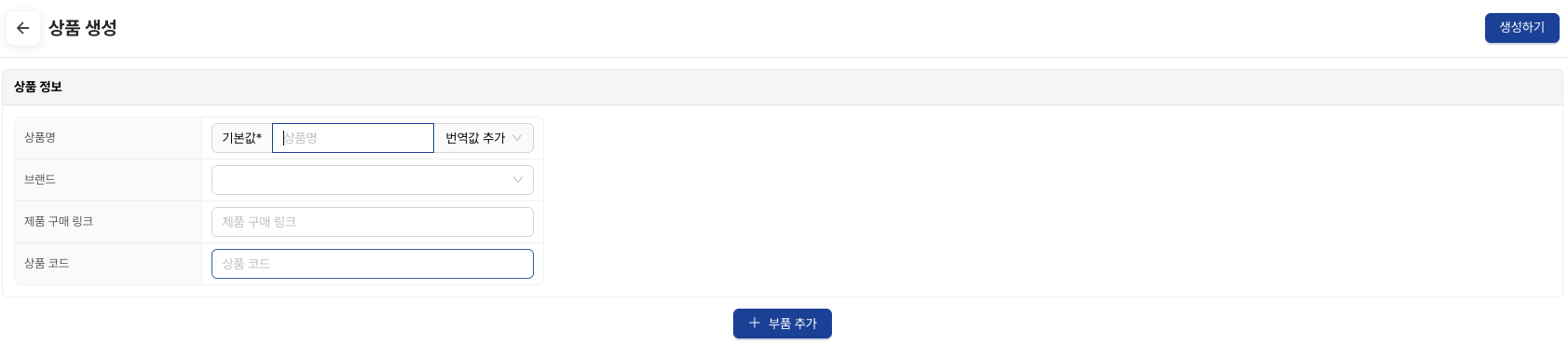 여기서 상품 생성 하기를 클릭하면 하기 서비스 화면을 확인할수 있습니다.