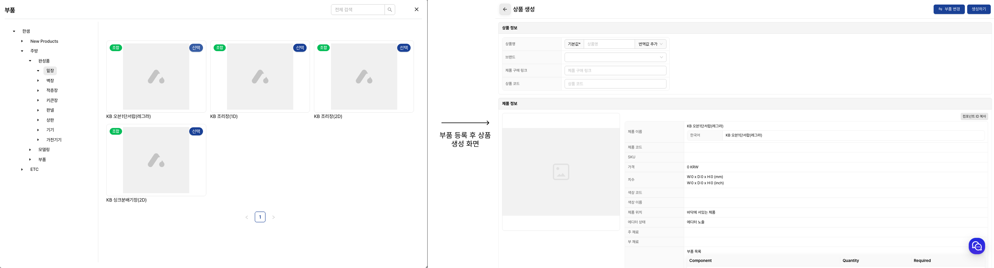 상기 정보를 기입하게 되면 + 부품 추가를 클릭하면 미리 구성된 부품 (모듈 조합)을 불러와 판매 상품에 연결할수 있습니다.