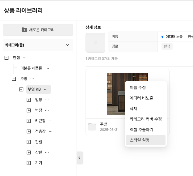 스타일 시스템은 상품라이브러리에서 폴더별로 적용이 가능합니다. 상기 서비스 화면으로 진입하여 스타일 설정을 클릭하게 되면 다음과 같은 서비스 화면을 확인할수 있습니다.