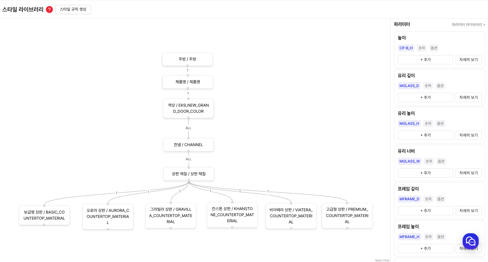 스타일 시스템은 기업 파라미터를 기준으로 구성이 가능하고 파라미터간 관계, 예를들어, A 제품에는 B,C,D 재질을 사용할수 있다면 상기 예시처럼 관계를 설정하면 그 설정된 규칙에 따라 제품을 노출시킬수 있습니다.