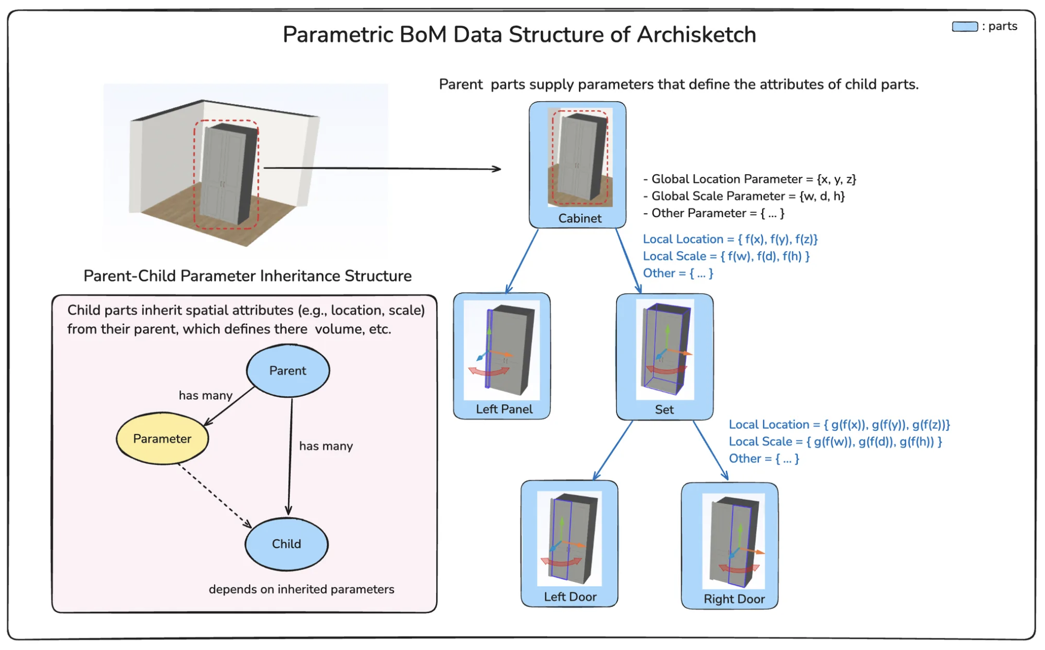 Parametric Component is a conceptual framework designed to dynamically express intrinsic properties (such as volume, shape, etc.) and configurable options. Data is structured in a component tree where multiple parent-child relationships exist between nodes. The root node of this tree can possess a variety of parameters, which are inherited by its child nodes. The usage of parameters received from a parent is specified in the form of metadata, called as a Parametric-Recipe, which is applied to the Parametric Component Composition corresponding to each edge in the tree. This approach allows every node within the tree to support flexible and dynamic designs in response to changes in the parent’s parameters. The process of constructing this tree and defining the parameter and recipe data is what constitutes the design of a Parametric Component.